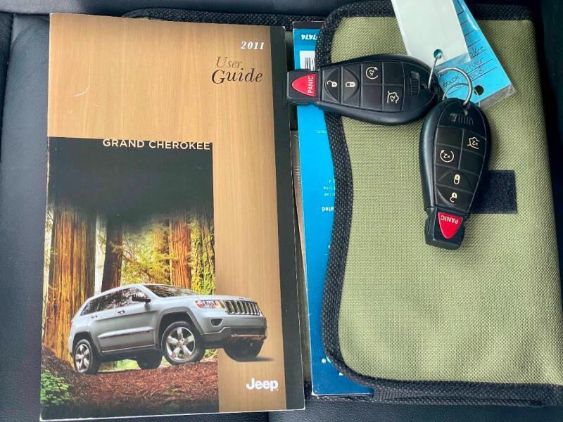 2011 JEEP GRAND CHEROKEE LAREDO 4X4 5.7L V8 AUTOMATIC TRANSMISSION, SILVER ON BLACK, LEATHER INTERIOR, CLEAN FLA TITLE, CLEAN CARFAX, SUPER LOW MILES, FULLY LOADED, SUNROOF, BACK UP CAMERA, CD PLAYER, COLD AC, ALLOY WHEELS, GOOD TIRES AND MUCH MORE, READY FOR FLAT TOW WITH PROFESSIONAL SET-UP BASE PLATE AND TOW BAR, ALL ORIGINAL, INSPECTED AND SERVICED, LOOKS AND RUNS GREAT.